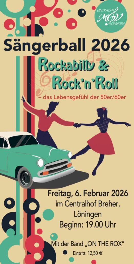 Am Freitag, dem 06.02.2026 findet wieder unser tradioneller Sängerball statt. in diesem Jahr unter dem Motto „Rockabilly & Rock ˋn Roll“, das Lebensgefühl der 50er und 60er Jahre.